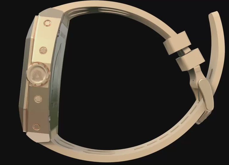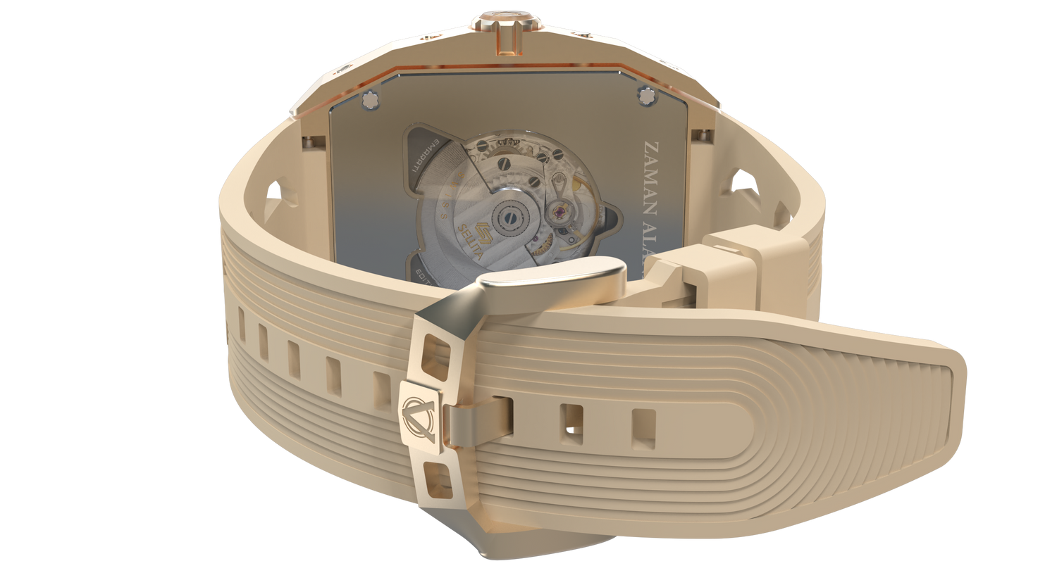 Each Rimal Al Turath timepiece is fitted with a custom-designed fluora rubber strap that integrates seamlessly with the case, forming a single sculptural silhouette.