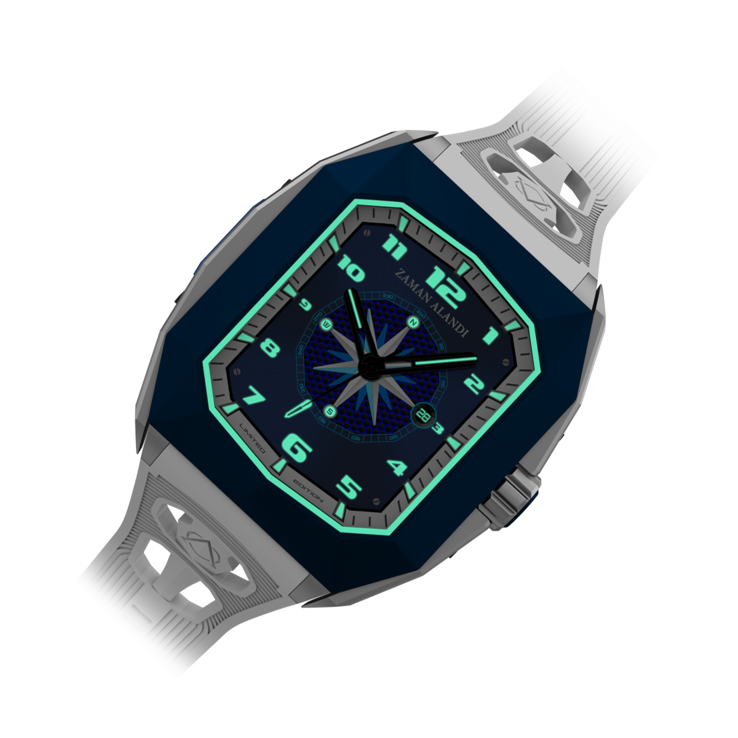 As night falls, Bahr Al Turath Navy White awakens with a luminescent glow, echoing the moonlight reflecting on the open sea. Coated in Swiss Super-LumiNova, its navy blue dial takes on a new depth, like waves shimmering under the stars. A perfect fusion of elegance and function, it stands as a guiding light for those who navigate the unknown—wherever the tide may lead.
