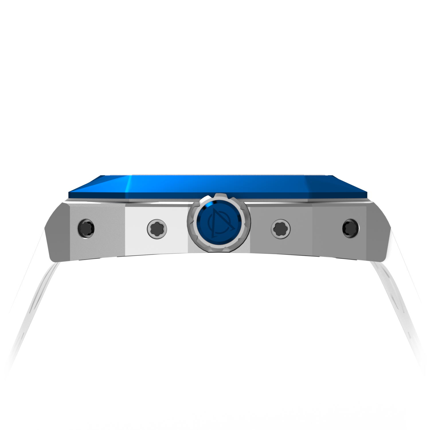 The case features a one-of-a-kind geometry, unlike any other watch in the world, making it truly unique in design and structure. The case frame is made entirely of Pure Titanium, being ultra-light and incredibly strong with side inserts, from 316L Stainless Steel. The entire case is decorated with a specially designed Geneva pattern on the surface and a badged unique panel underneath for added distinction. To achieve its precise form, the case undergoes multiple gravity presses, requiring at least 400 tons of heavy machinery to shape it to perfection.