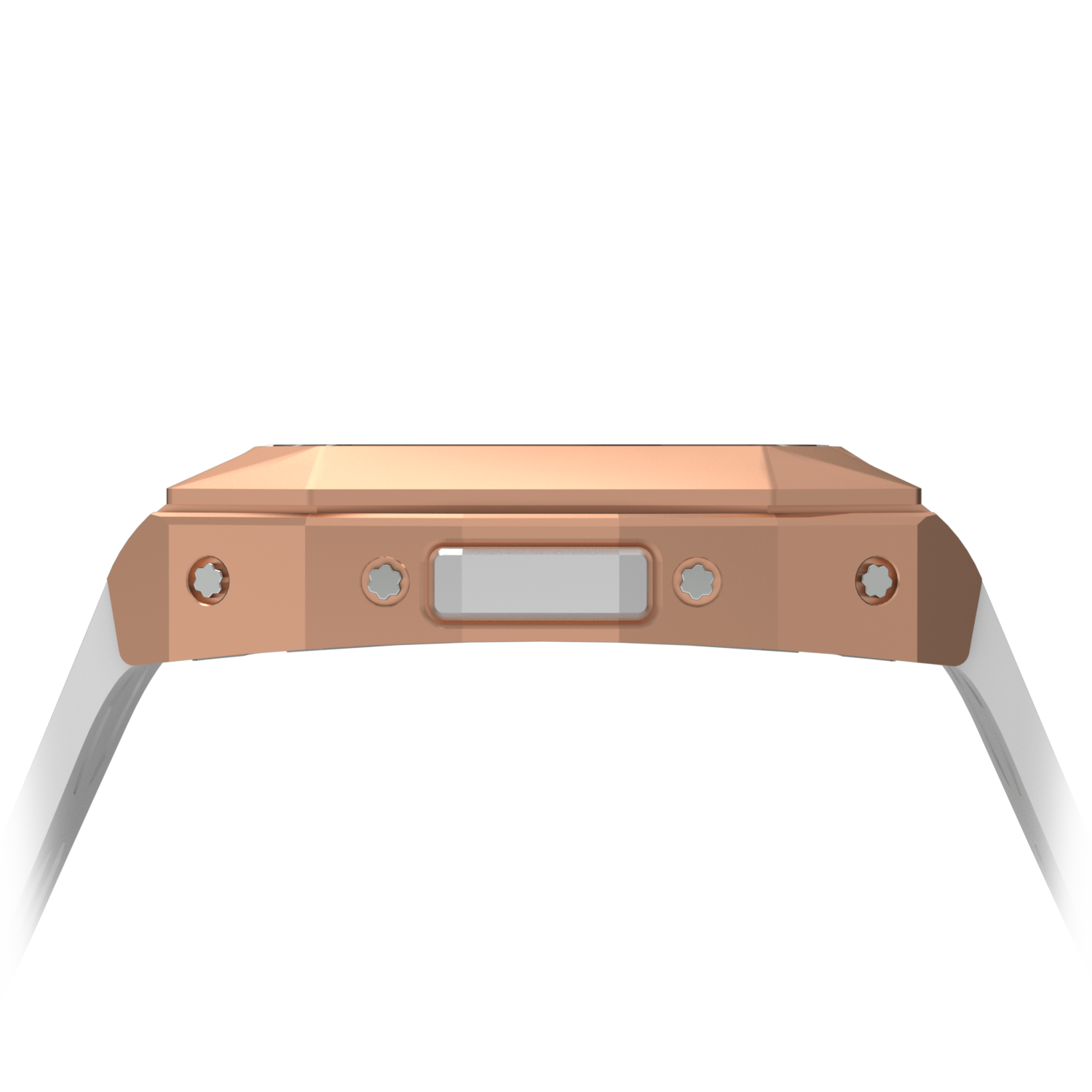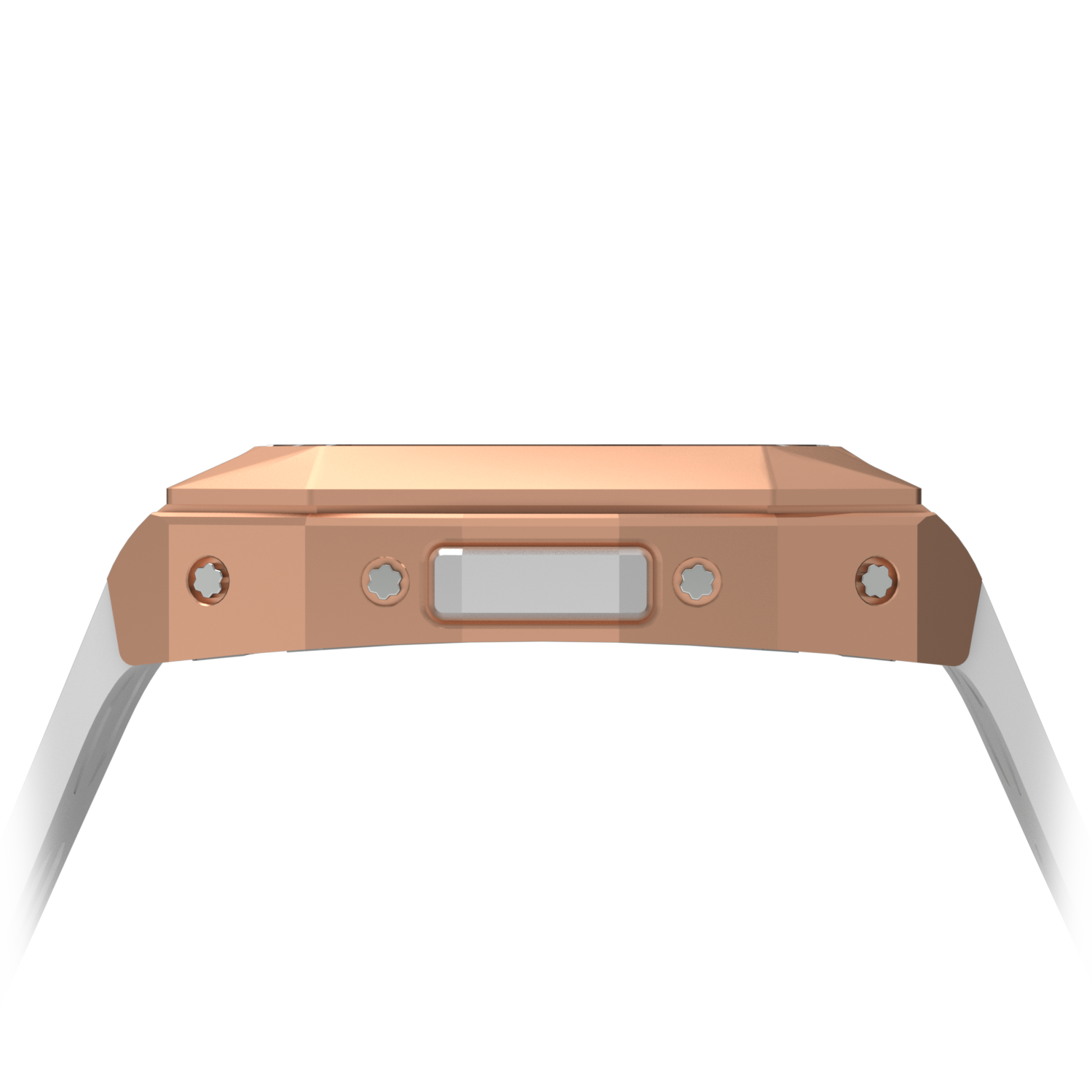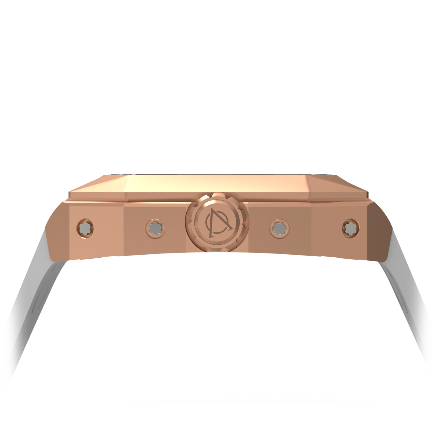 The side view features a crown, framed by 316L stainless steel inserts with polished and PVD-plated finishes. The clean, geometric lines of the case create a balanced and modern silhouette, blending sharp edges with smooth curves. This thoughtful design highlights the watch’s attention to detail and timeless craftsmanship.