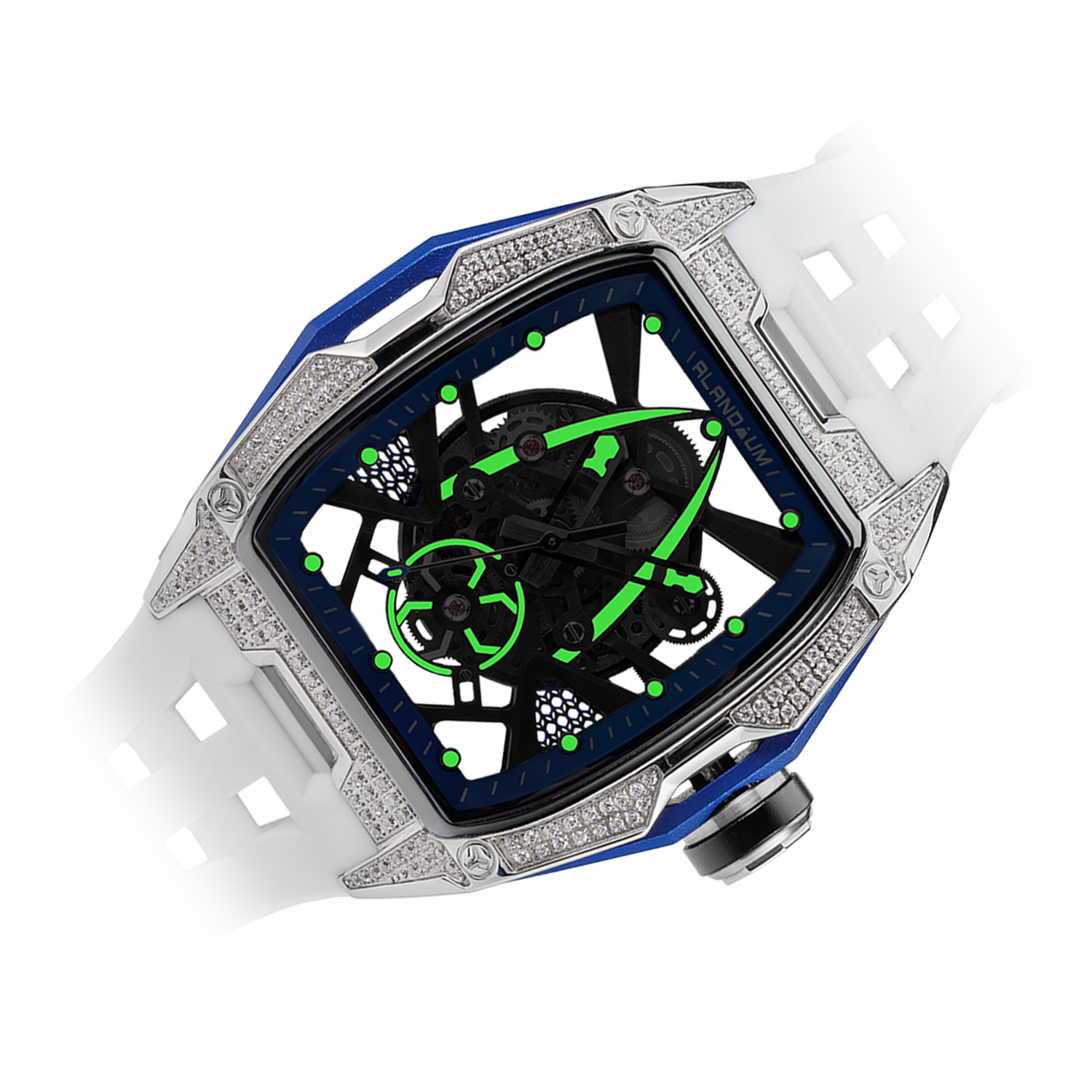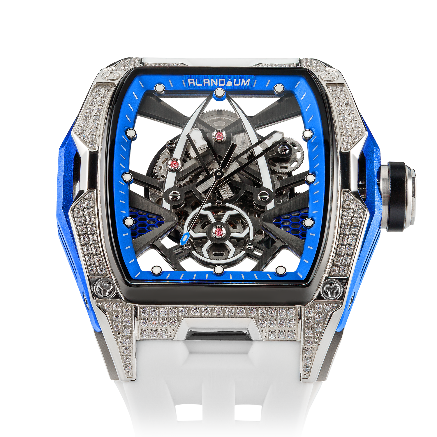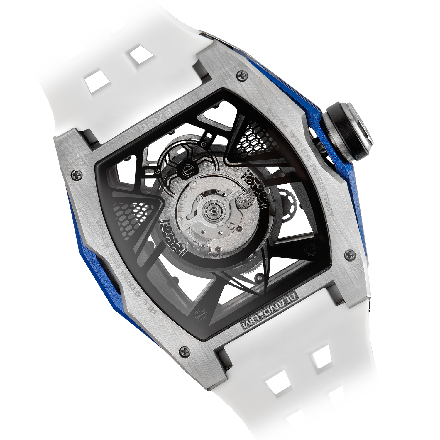 Immerse yourself in the depth of the Hyperion Bianco Blu skeleton dial, catching the light and making you stand out wherever you go.