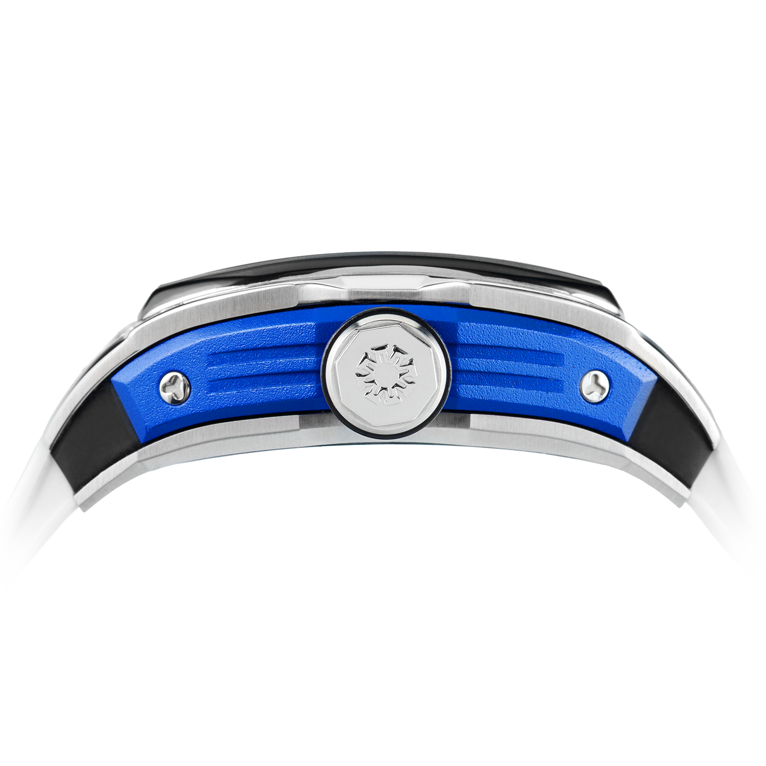 The Hyperion Bianco Blu features crisp white hands and markers enhanced with Super-LumiNova, ensuring exceptional clarity on its blue dial. Combining effortless style with day-and-night visibility, this timepiece is a perfect blend of style and functionality.