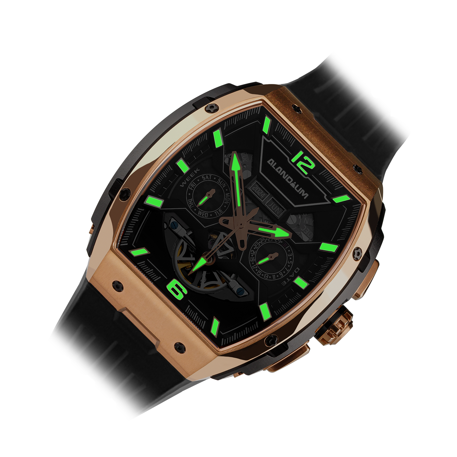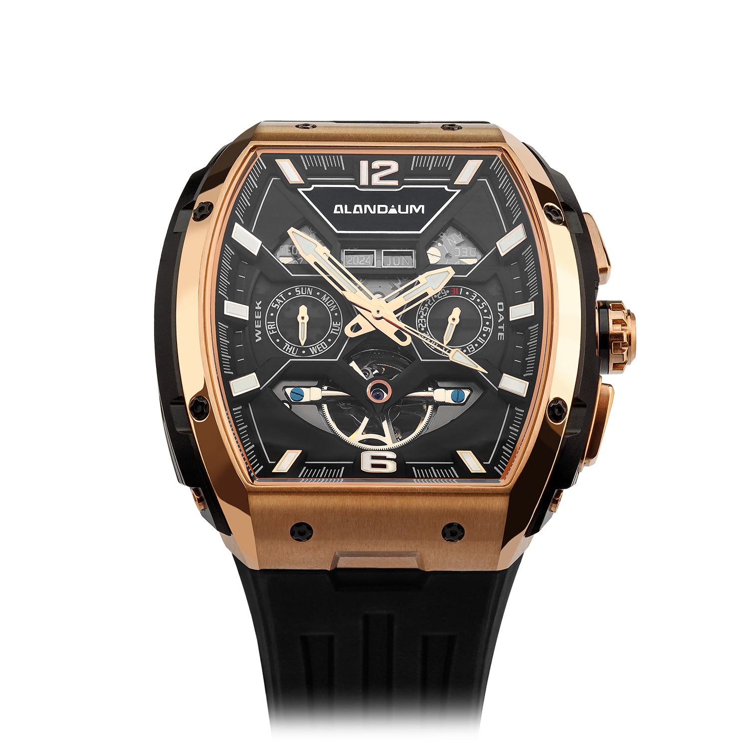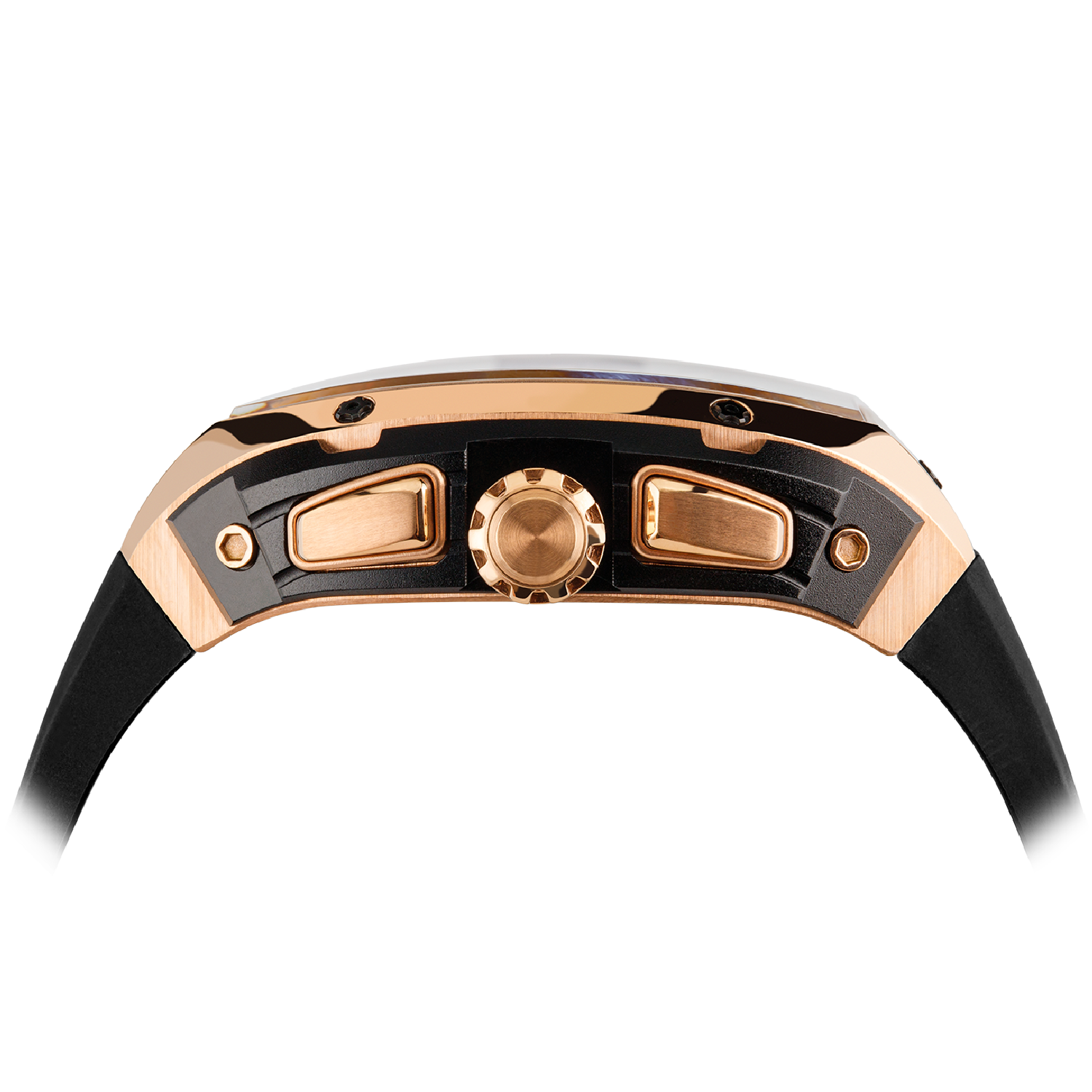Slip into effortless sophistication with the Mercurius Rose Gold. A multilayered dark dial, the perfect canvas for both sharp focus and quiet contemplation, within a luxurious rose gold case.