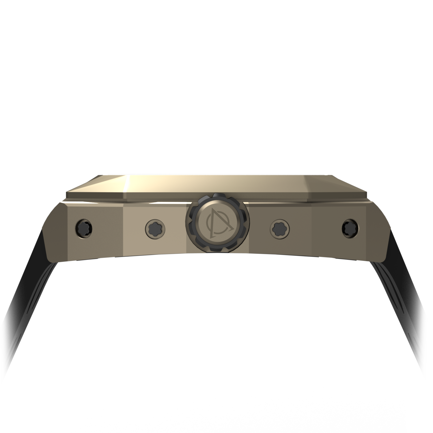 The side view features a crown, framed by 316L stainless steel inserts with polished and PVD-plated finishes. The clean, geometric lines of the case create a balanced and modern silhouette, blending sharp edges with smooth curves. This thoughtful design highlights the watch’s attention to detail and timeless craftsmanship.