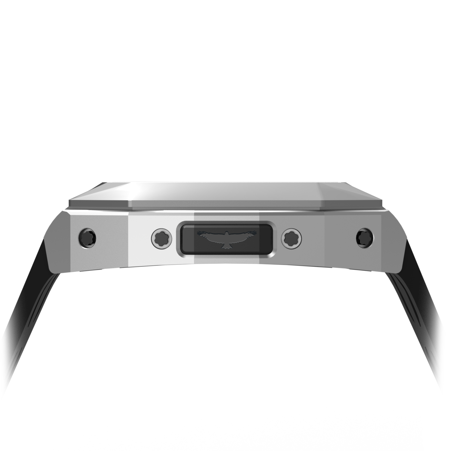The left side of the watch features a crystal insert at its center, showcasing a flying falcon - an iconic symbol of UAE culture, representing freedom, strength, and precision. The falcon is meticously engraved into the crystal. This elegant detail adds a touch of heritage and artistry, making the watch a true tribute to Emirati identity.