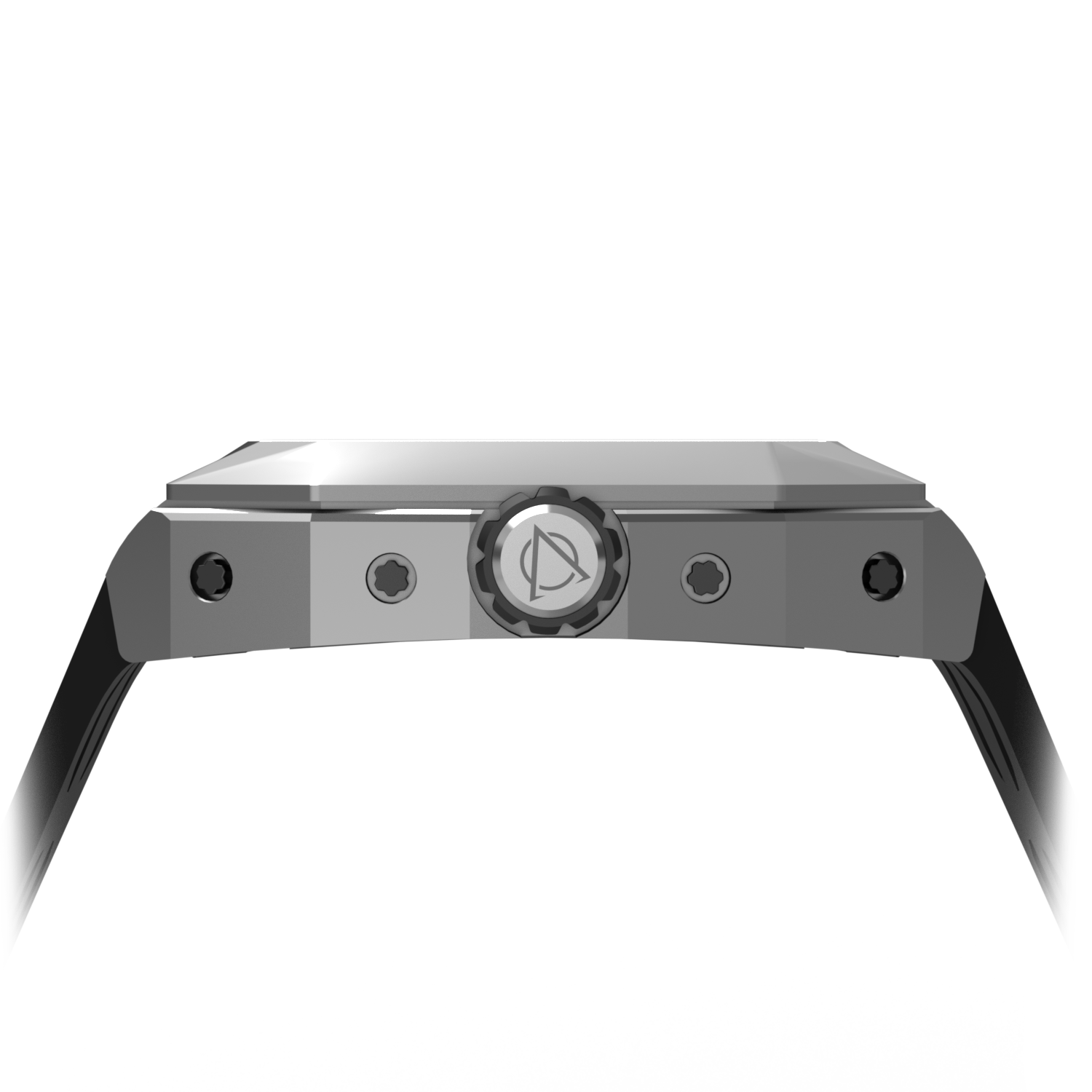 The side view features a crown, framed by 316L stainless steel inserts with polished and PVD-plated finishes. The clean, geometric lines of the case create a balanced and modern silhouette, blending sharp edges with smooth curves. This thoughtful design highlights the watch’s attention to detail and timeless craftsmanship.