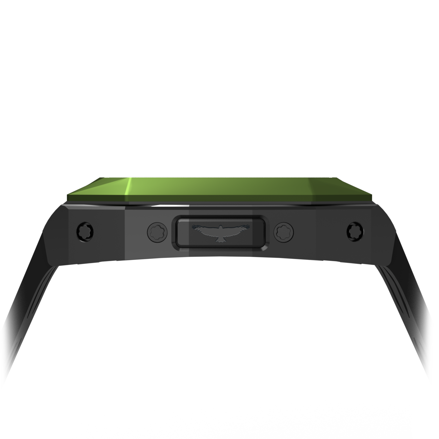 The left side of the watch features a crystal insert at its center, showcasing a flying falcon - an iconic symbol of UAE culture, representing freedom, strength, and precision. The falcon is meticously engraved into the crystal. This elegant detail adds a touch of heritage and artistry, making the watch a true tribute to Emirati identity.