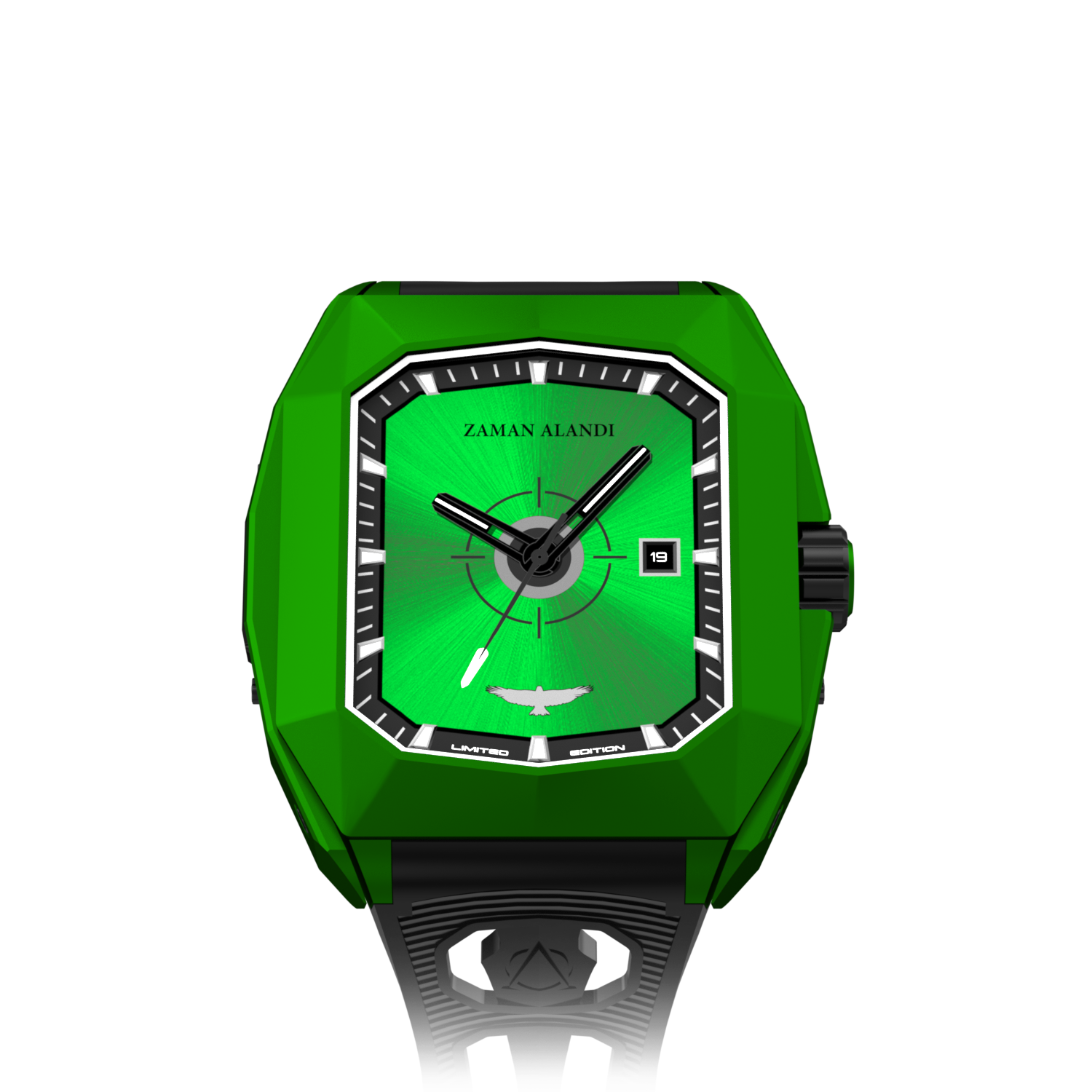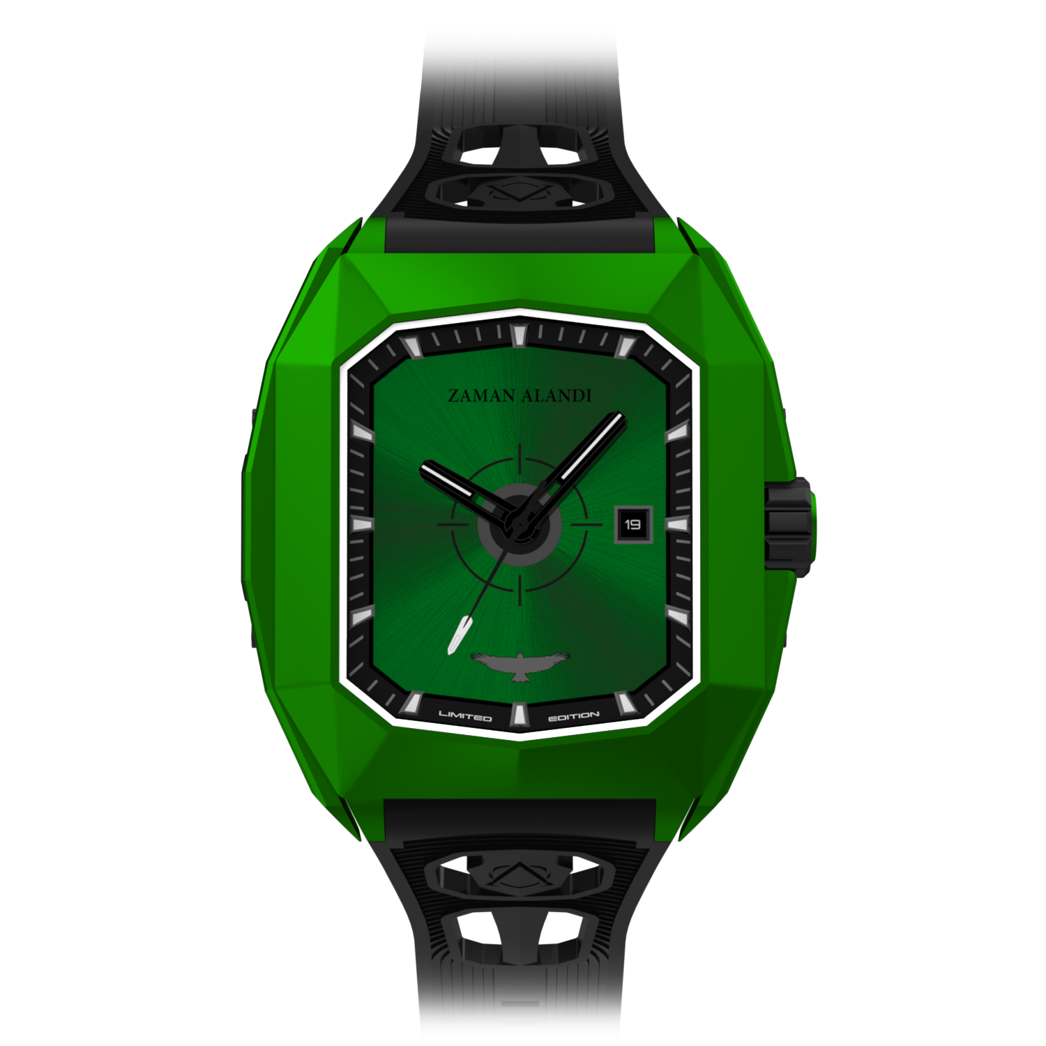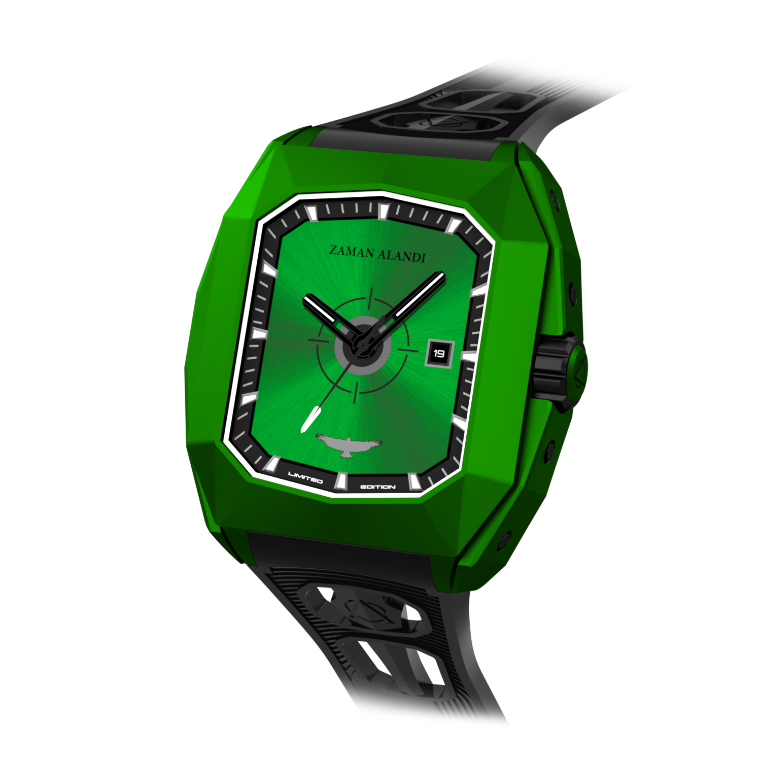 The green dial evokes the energy of untamed landscapes, where every moment counts. The falcon emblem at the bottom stands for vision and courage. A sleek date function adds a touch of practicality, making this watch a true companion for those who carve their own path with boldness and precision.